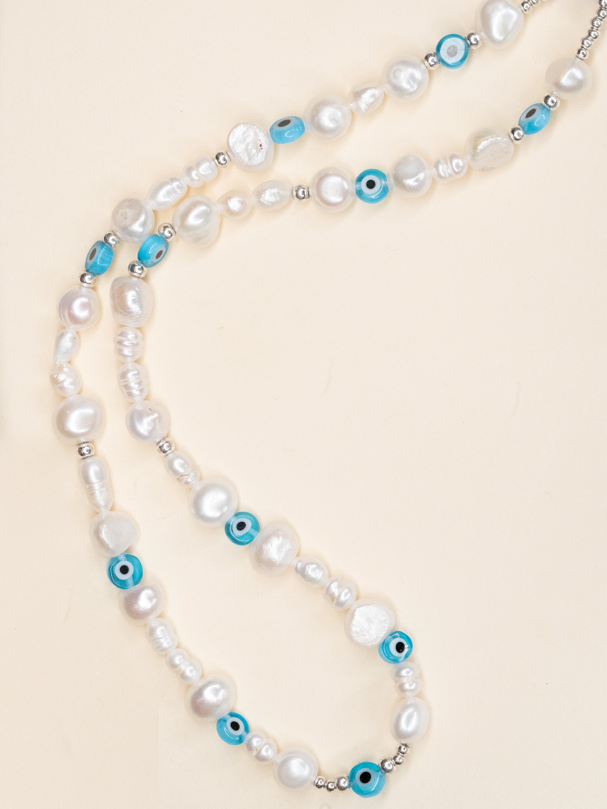 High quality 4-8mm freshwater pearl, silver beads, glass evil eye & silver sterling finishing.