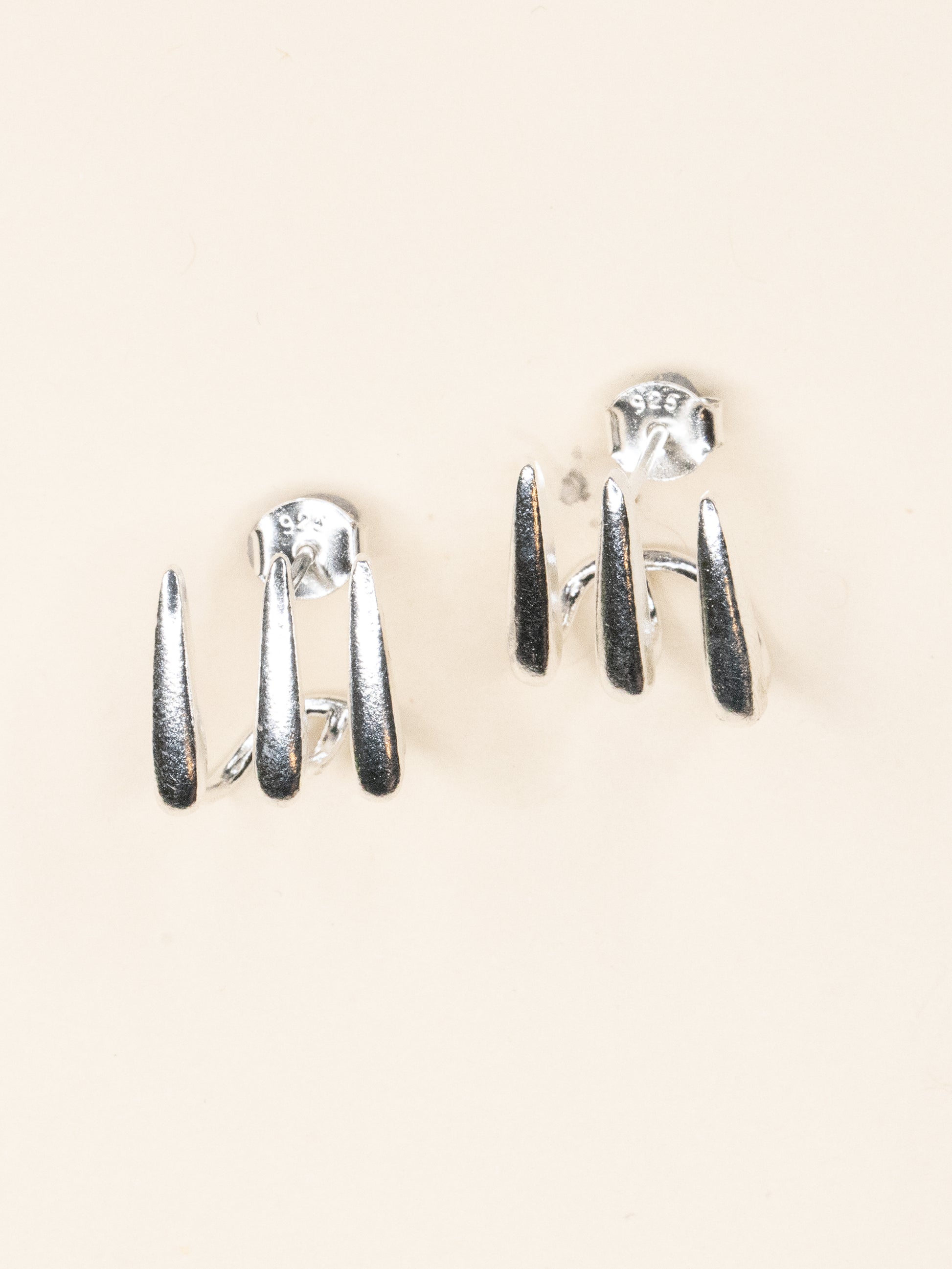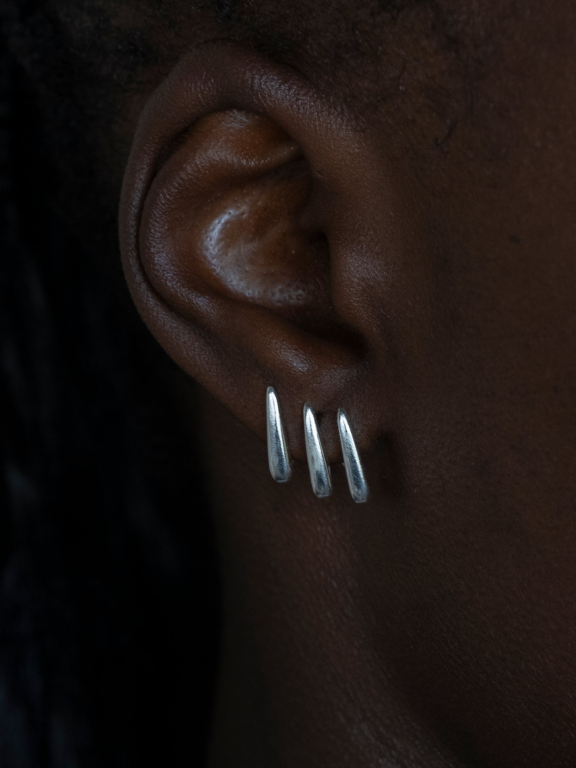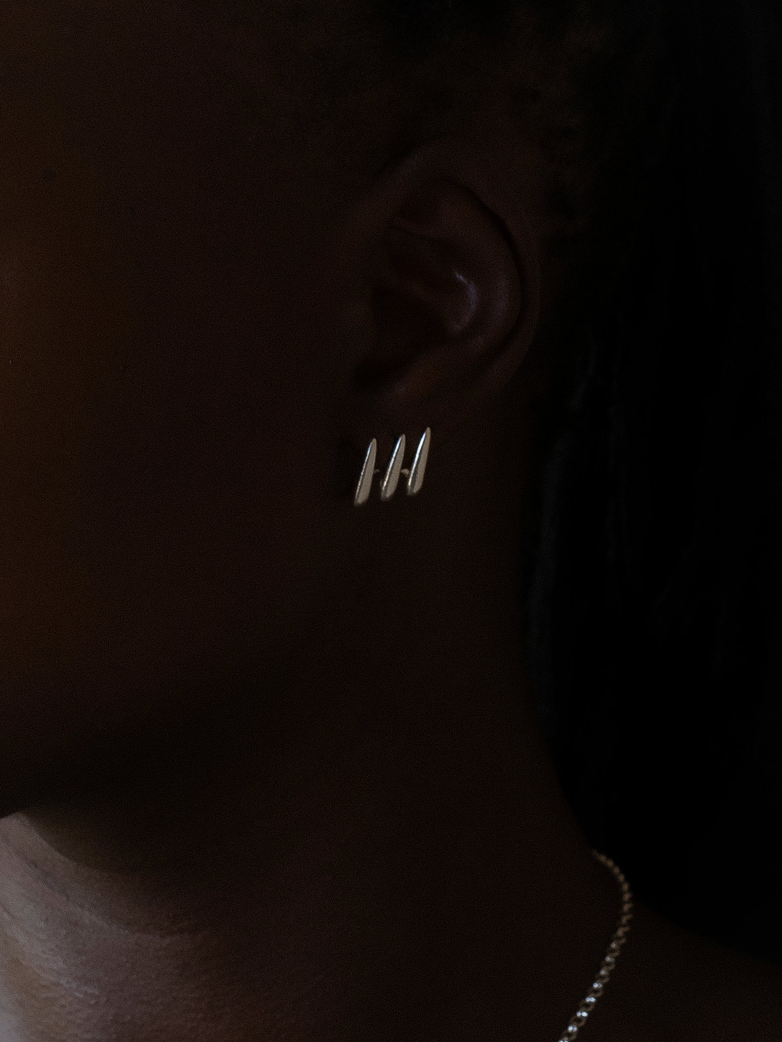 Saato earrings feature a smooth, reflective surface inspired by the form of Maasai spears. Their clean lines evoke precision and strength, creating a minimalist yet striking presence.