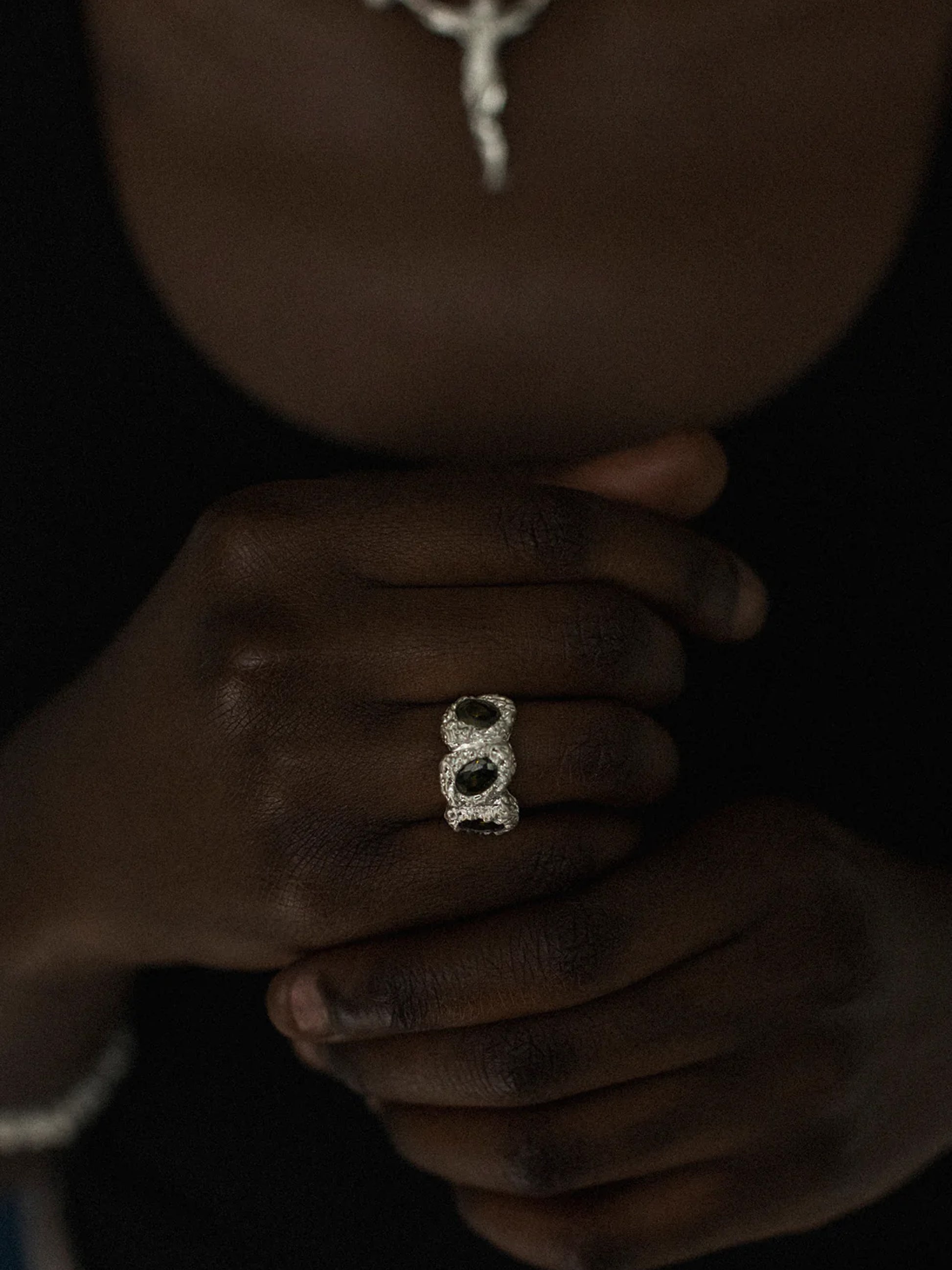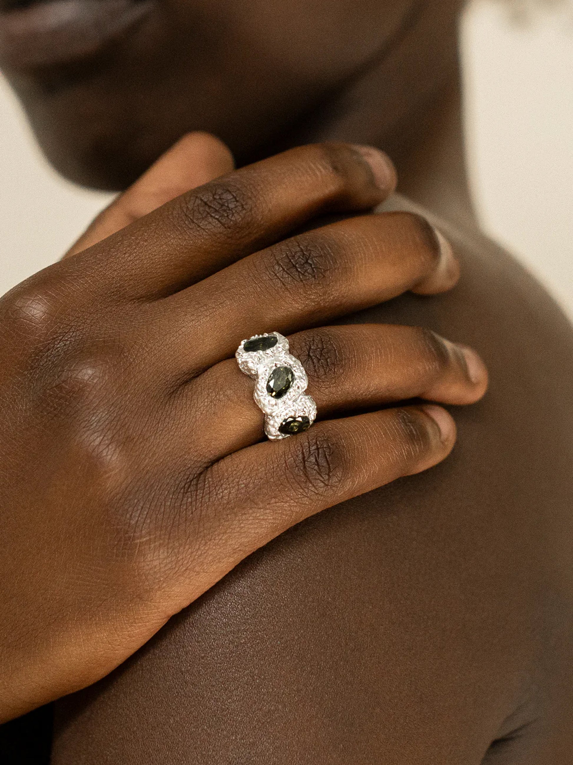 Kijani ring is a striking blend of elegance and edginess. The rough textures enhance the charm, making it a conversation starter and a statement accessory. The mesmerizing creation is inspired by the untamed wonders of nature.