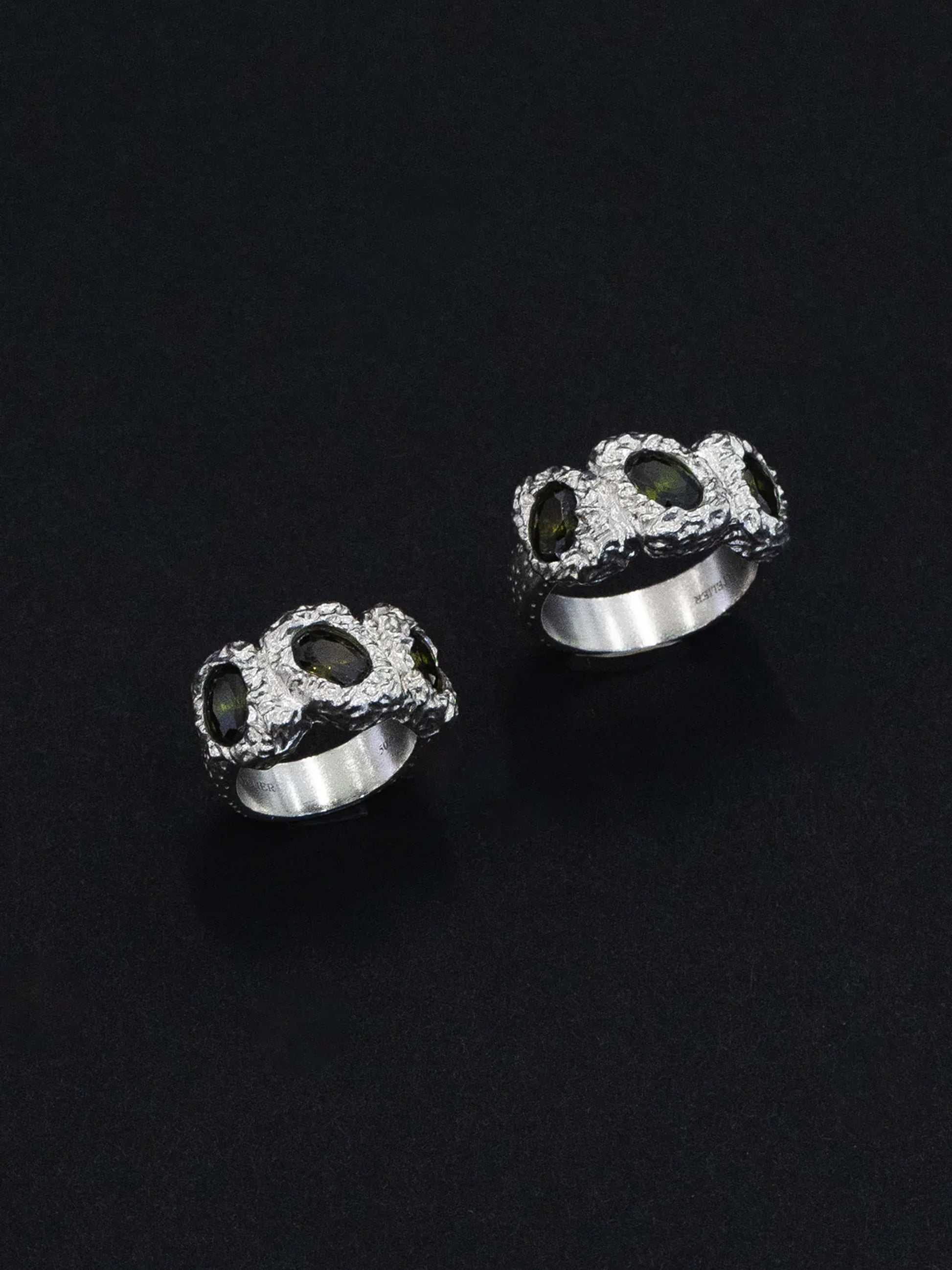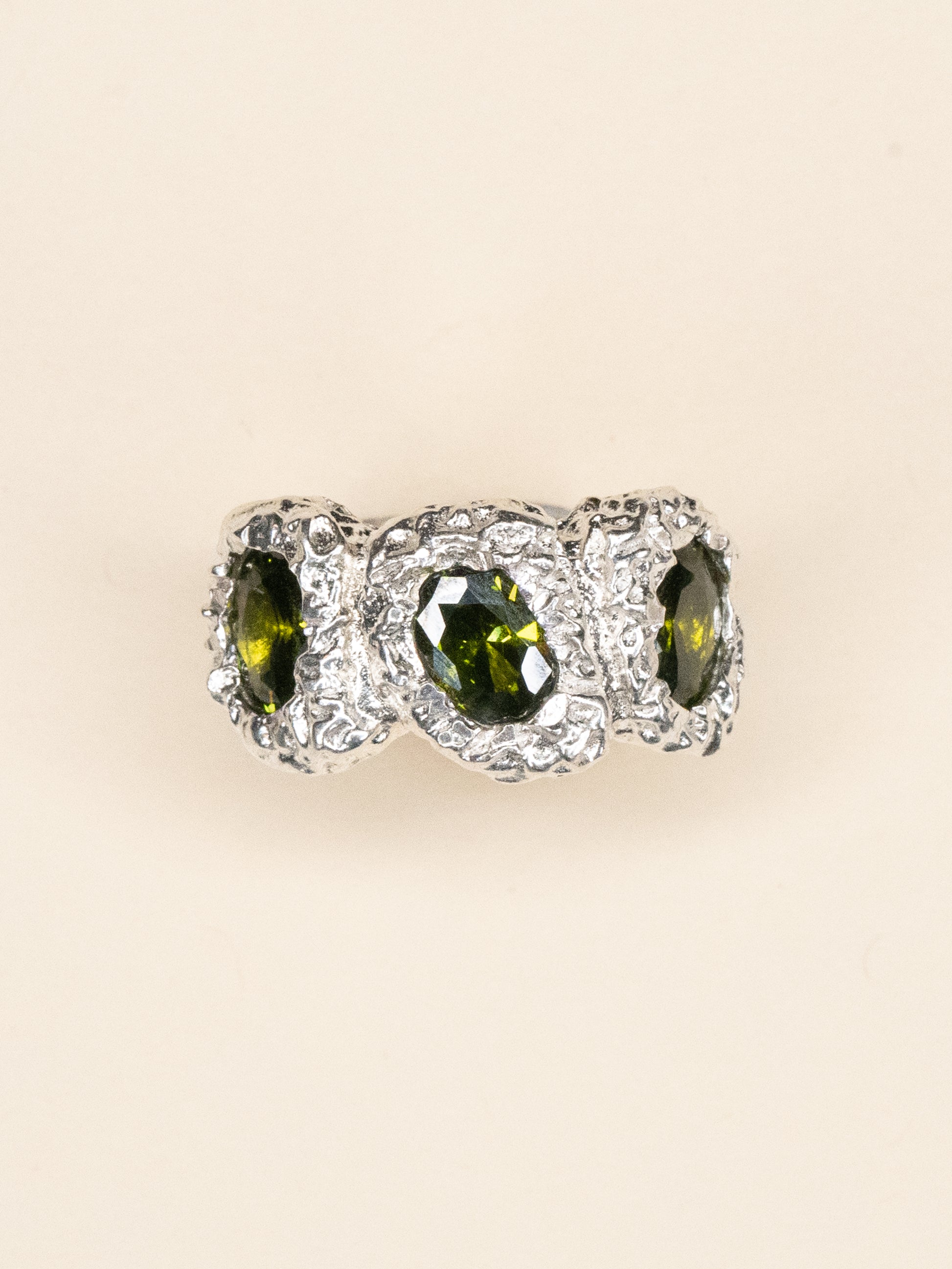 .925 Sterling Silver & three green high-quality zirconia stones.