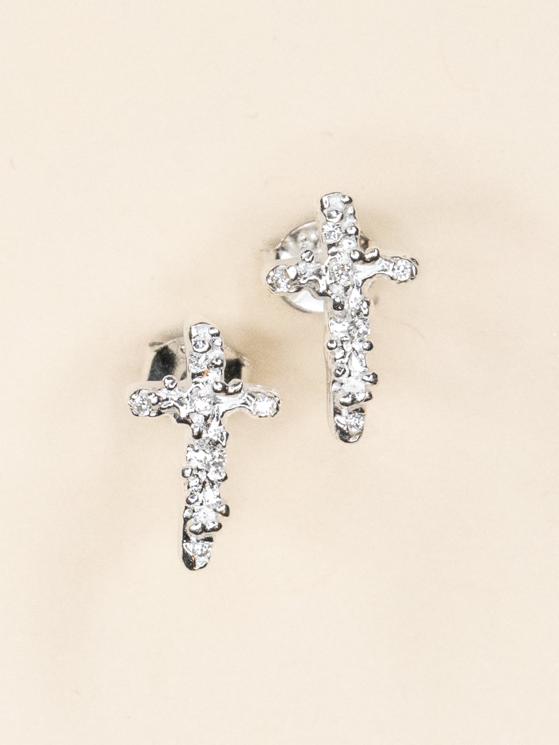 These earrings started off as a dagger design but were later redesigned into a cross, giving them a unique twist. The mix of the textured surface and sparkling zirconia stones creates a perfect balance of bold and unique design.