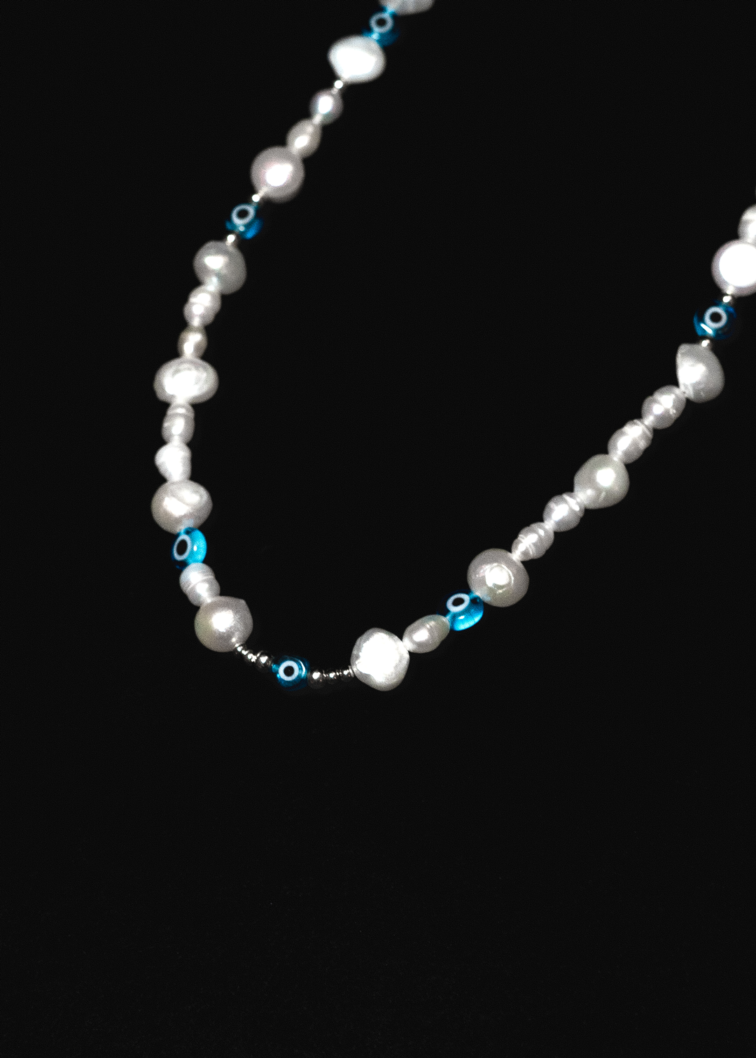 High quality 4-8mm freshwater pearl, silver beads, glass evil eye & silver sterling finishing.