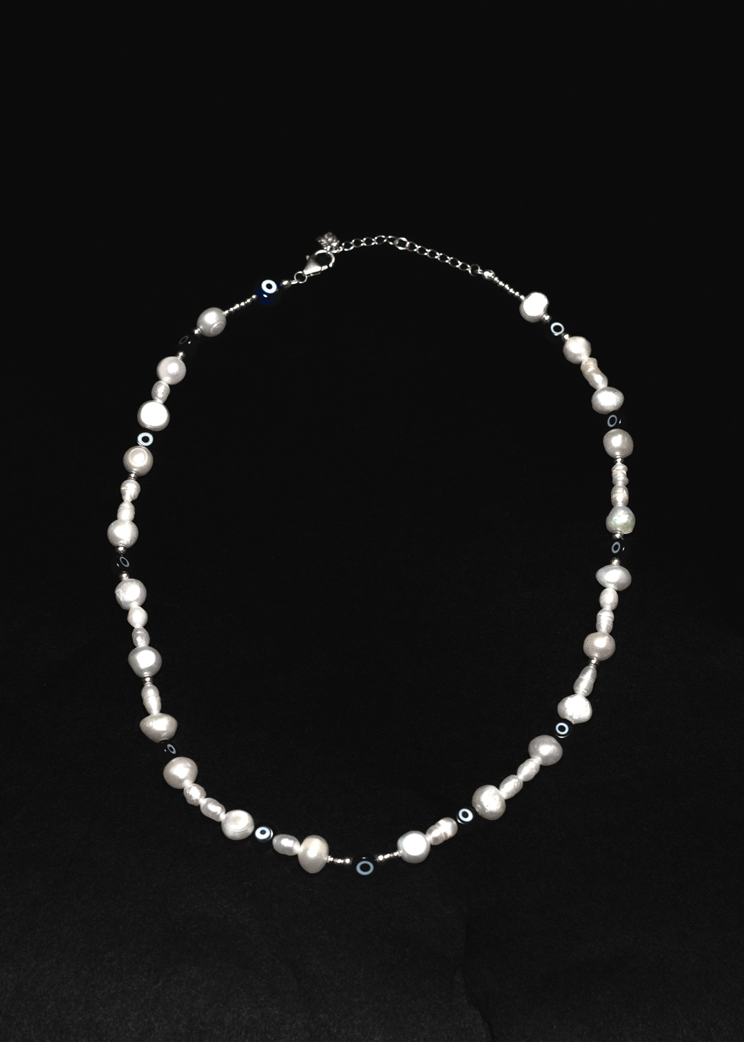 High quality 4-8mm freshwater pearl, silver beads, glass evil eye & silver sterling finishing.